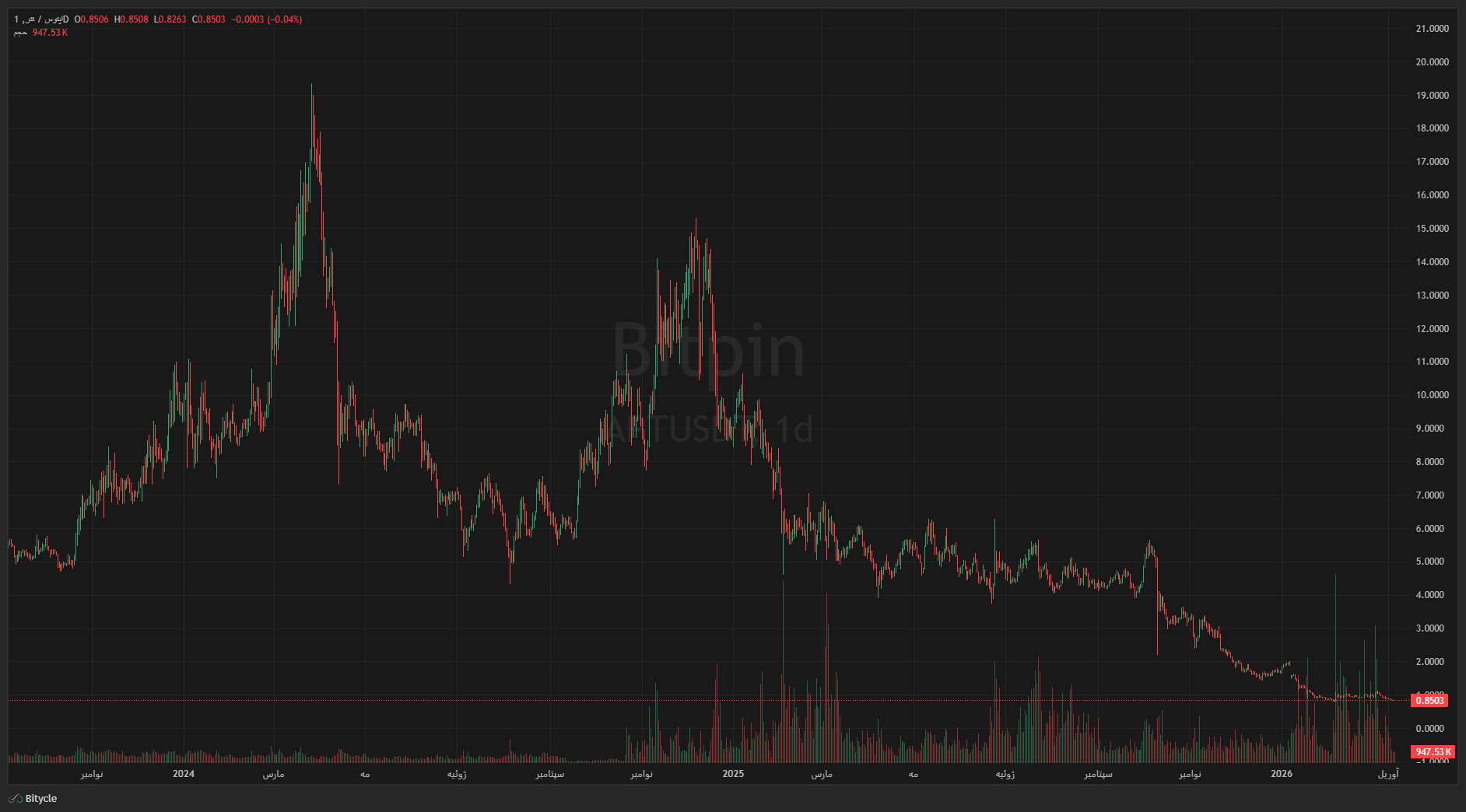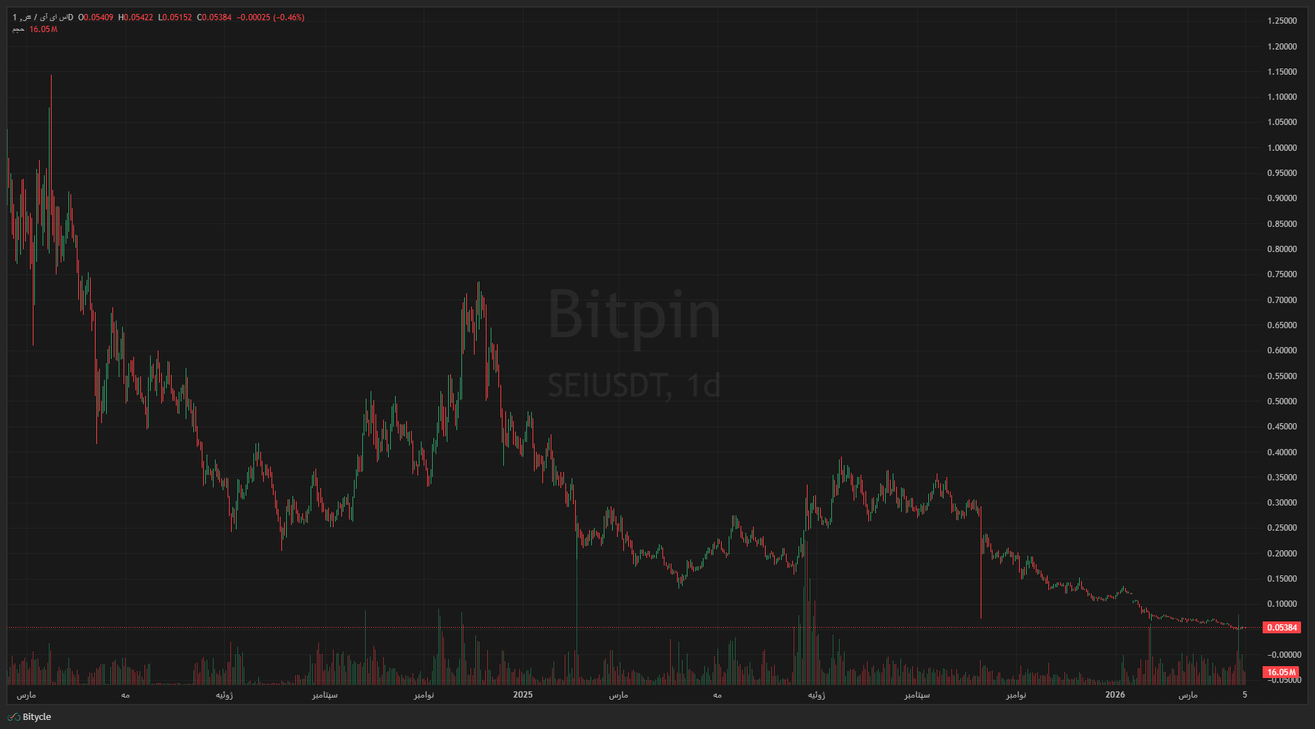 سِی در محدوده ۰.۰۵۴ دلار معامله میشود. ۵۱ درصد افت از ابتدای سال، اما در هفت روز گذشته تقریباً بدون تغییر مانده. همین ثبات نسبی در دل یک روند نزولی سنگین، خودش نشانهای است که ارزش دقت کردن دارد.