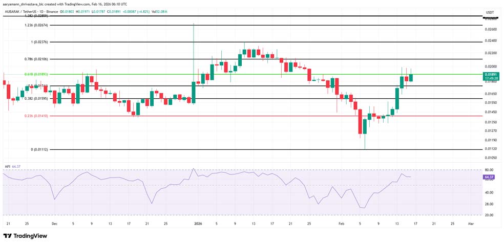 شاخص MFI در سطح ۶۴٫۳۷ قرار دارد که فشار خرید مبارک قوی را بدون نشان دادن شرایط اشباع خرید بالای ۸۰٫۰ منعکس میکند. یک بسته شدن روزانه قوی بالای ۰٫۰۱۸۹ دلار کنترل صعودی را تأیید کرده و این میم کوین را در معرض هدف صعودی بعدی در ۰٫۰۲۱۰ دلار (فیبوناچی ۰٫۷۸۶) قرار میدهد و پس از آن ۰٫۰۲۳۷ دلار (فیبوناچی ۱٫۰) هدف بعدی است.