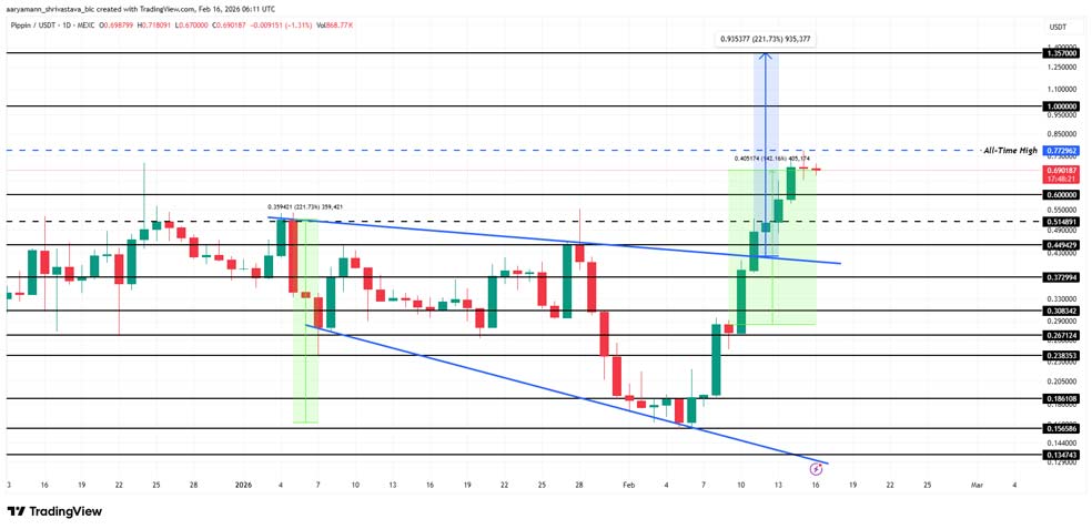 پیپین رشد عمودی داشته و طی هفت روز گذشته ۱۴۲ درصد افزایش یافته و در زمان نگارش این مطلب با قیمت ۰٫۶۹۰ دلار معامله میشود. این کوین در حال حاضر بهترین عملکرد را در فضای میم کوینها در این هفته دارد. از نظر ساختاری، قیمت از الگوی کنج پهنشونده نزولی (Descending Broadening Wedge) خارج شده است؛ الگویی که معمولاً در صورت تأیید، پیش از گسترش نوسان قیمت بالا ظاهر میشود.