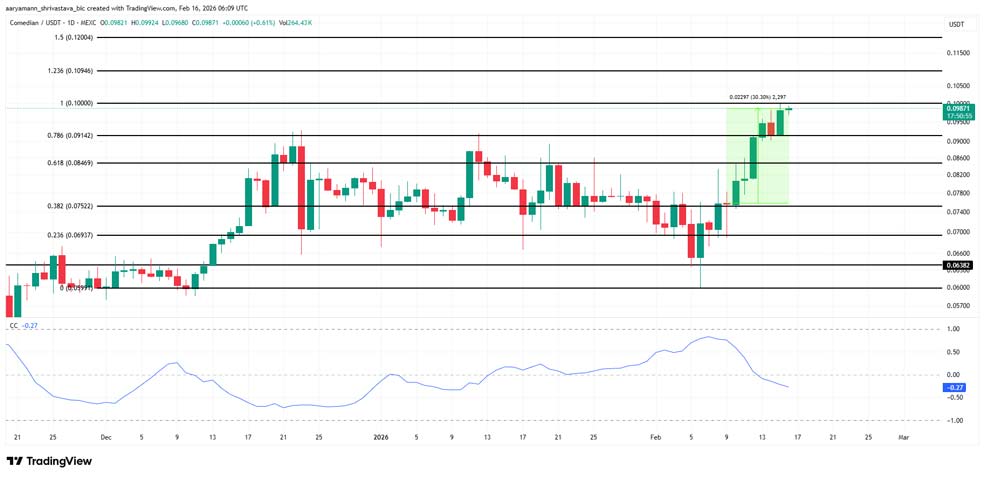 کمدین بهعنوان یکی از میم کوینهای با عملکرد قویتر این هفته ظاهر شده و با رشد ۳۰ درصدی در زمان نگارش با قیمت ۰٫۰۹۸۷ دلار معامله میشود. این رالی قیمت کمدین را به بالای سطح مقاومت ۰٫۰۹۱۴ دلار رسانده است. این شکست نشاندهنده افزایش علاقه سفتهبازانه و بهبود مومنتوم معاملاتی کوتاهمدت است.