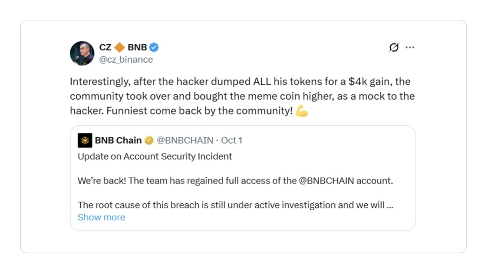 داستان از آنجا شروع شد که حساب رسمی شبکه BNB هک شد و در واکنش به این حادثه، یک توکن جدید طنزآمیز به نام «۴» در بلاکچین BNB پا گرفت. خیلی زود، CZ، بنیانگذار بایننس، در رسانههای اجتماعی به این میم کوین اشاره کرد و این اشاره، جرقهای برای یک انفجار قیمت آن شد. در همان ساعات اولیه، یکی از تریدرهای ریسکپذیر با سرمایهگذاری تنها ۳٬۰۰۰ دلار در این توکن شاهد تبدیل شدن آن به حدود ۲ میلیون دلار شد.