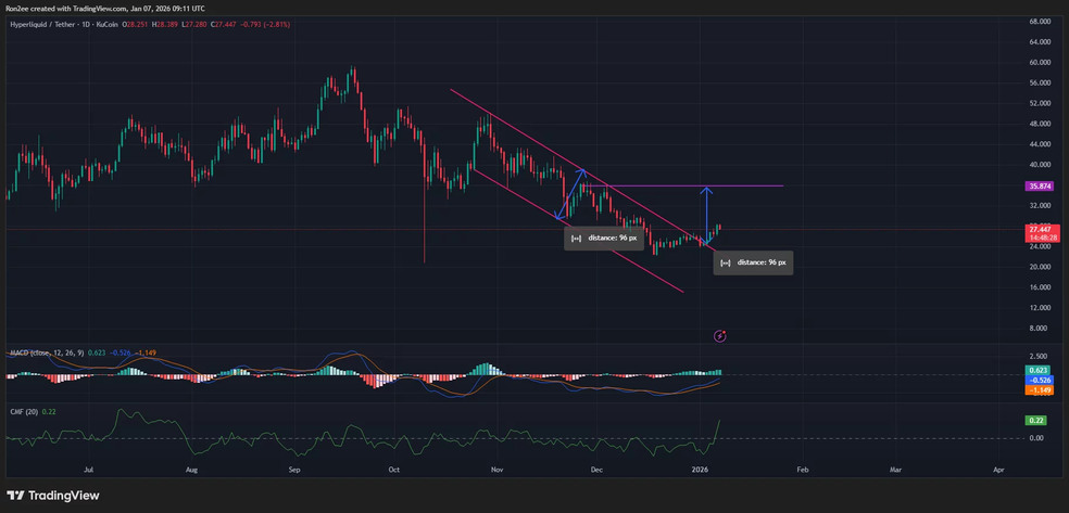 از نظر تکنیکال، HYPE از الگوی کانال نزولی چندماهه در نمودار روزانه خارج شده که نشاندهنده کنترل خریداران بر بازار است. اندیکاتور MACD یک تقاطع صعودی با هیستوگرامهای سبز نشان میدهد و Chaikin Money Flow در سطح مثبت ۰.۲۲ قرار دارد، که هر دو تاییدکننده ورود سرمایه جدید هستند. تحلیلگران هدف بعدی را سقف ۴ دسامبر یعنی ۳۵.۸ دلار (۳۰ درصد بالاتر از سطوح فعلی) پیشبینی میکنند.