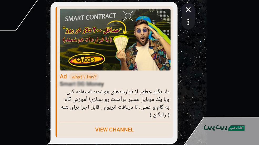 در روش دیگر، شما در کانال معتبری عضو هستید و در پایان پیامهای کانال با تبلیغی مواجه میشوید که تصور میکنید معتبر است و با کلیک بر روی تبلیغ ممکن است مورد حمله امنیتی قرار بگیرید.