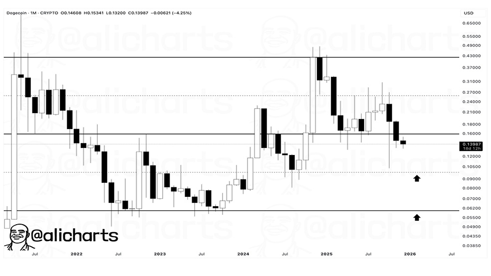 علی مارتینز (Ali Martinez)، تحلیلگر مطرح بازار رمزارز، دو سطح حمایتی مهم برای دوجکوین در ۰.۱۰ و ۰.۰۶۲ دلار شناسایی کرده است. او پیشتر نیز یک الگوی «مثلث نزولی» در نمودار سهروزه دوجکوین مشاهده کرده بود که میتواند زمینه جهش قیمتی تا ۰.۲۱ دلار را فراهم کند که حدود ۵۳ درصد بالاتر از قیمت فعلی محسوب میشود.