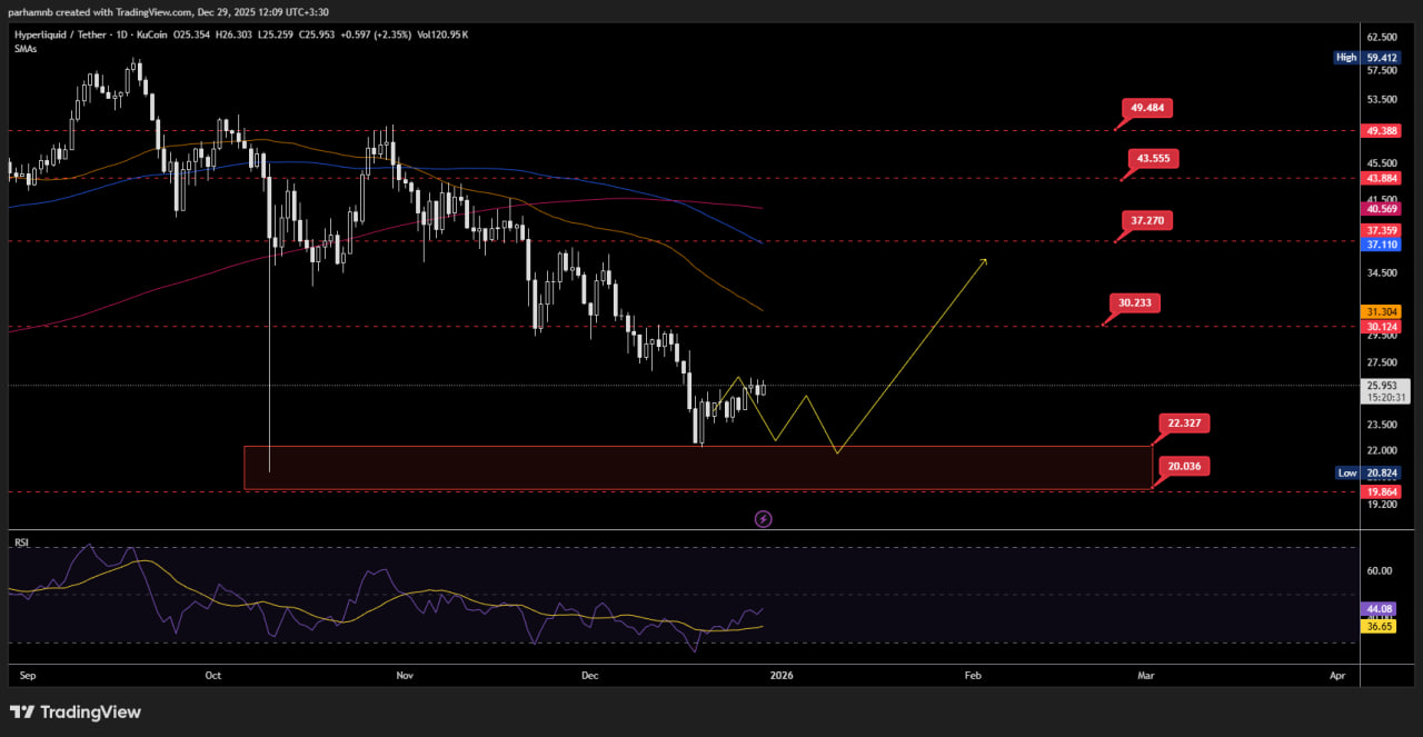 قیمت هایپرلیکویید پس از روند نزولی شدید، به محدوده حمایتی بسیار مهمی در بازه قیمتی ۲۰ تا ۲۲ دلار رسیده است. این ناحیه میتواند به عنوان نقطه بازگشت روند عمل کرده و شروع یک حرکت صعودی جدید را رقم بزند. در صورت واکنش مثبت به این محدوده حمایتی، اهداف قیمتی ۳۰، ۳۷، ۴۳ و ۴۹ دلار در دسترس خواهد بود.