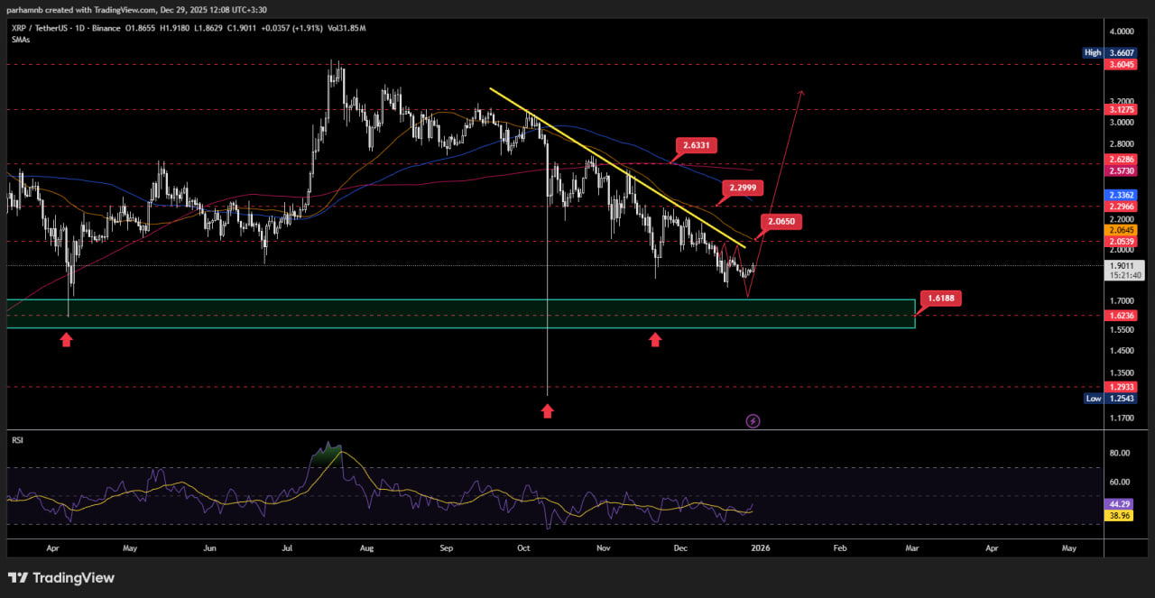 قیمت ریپل در حال حاضر در یک روند نزولی قرار دارد و زیر خط مقاومت داینامیک در نوسان است. این محدوده مقاومتی مانع از رشد قیمت در کوتاهمدت شده است. با این حال، منطقه حمایتی ۱.۶ دلار به عنوان یک ناحیه کلیدی عمل میکند که در صورت حفظ آن و عبور از مقاومت داینامیک، احتمال حرکت به سمت اهداف قیمتی ۲، ۲.۲۹ و ۲.۶۳ دلار وجود دارد.