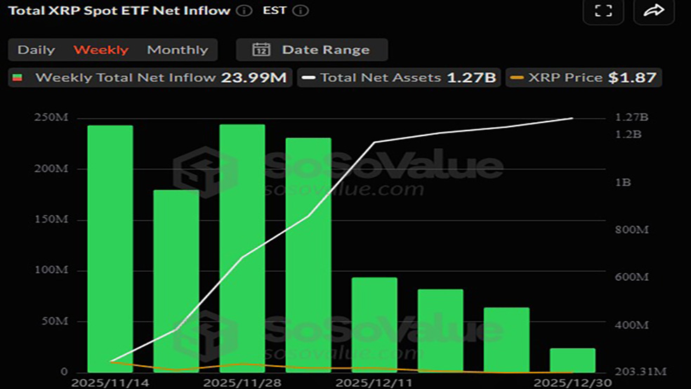 این صندوقها در اواسط نوامبر آغاز به کار کردند و بهسرعت مورد توجه قرار گرفتند. در طول سال ۲۰۲۵ حتی یک روز خروج سرمایه ثبت نکردند و مجموع ورود خالص سرمایه آنها از ۱.۱۶ میلیارد دلار عبور کرد، در حالی که ارزش داراییهای تحت مدیریت به حدود ۱.۲۷ میلیارد دلار رسید. با این حال، قیمت ریپل در بیشتر روزهای معاملاتی دسامبر زیر ۲ دلار باقی ماند.