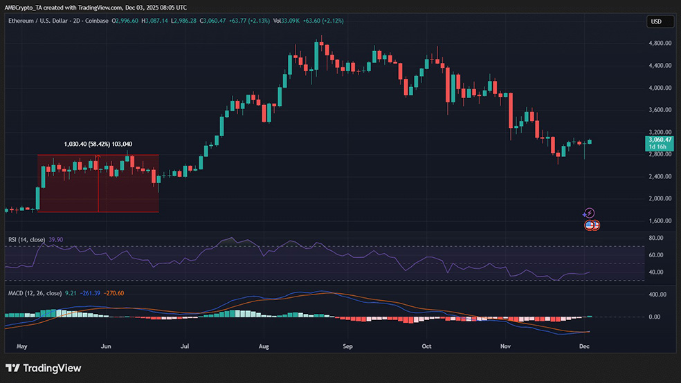 از نقطه نظر فنی، شرایط قیمت اتریوم شبیه دوره پکترا نیست. با وجود ثبات نسبی در محدوده ۳ هزار دلار پس از اصلاح ۴۳ درصدی، شاخصهایی مانند RSI و MACD نشانهای از بازیابی جدی ندارند. دادههای مشتقات اما متفاوت است؛ شاخص سود باز بالای ۱۷ میلیارد دلار و فاندینگ ریت مثبت نشان میدهد بخشی از معاملهگران منتظر صعود قیمت هستند. با این حال، هدف سالانه ۷ هزار دلار که تحلیلگران قبلاً مطرح میکردند فعلاً دور از دسترس به نظر میرسد، مگر اینکه اتریوم بتواند محدوده مقاومتی ۳۵۰۰ تا ۳۸۰۰ دلار را پس بگیرد.
