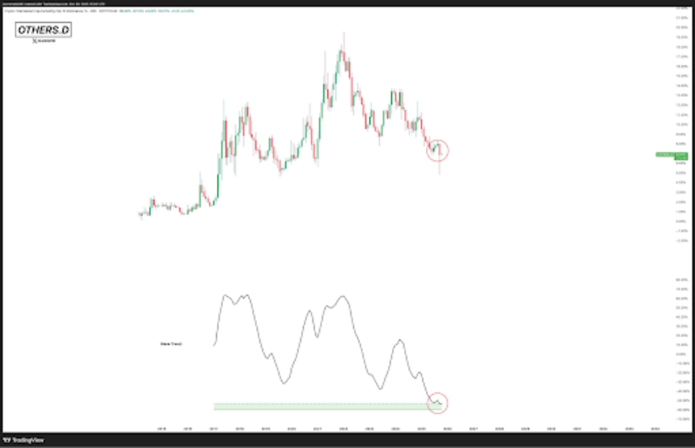به گفته تحلیلگر رمزارز «جاوون مارکس»، شاخص دامیننس آلتکوینها (Altcoin Dominance) برای اولین بار در تاریخ وارد محدودهی «اشباع فروش» شده است. این شاخص میزان سهم بازار تمام رمزارزها بهجز ده ارز برتر را اندازه میگیرد و کاهش شدید آن معمولاً نشانهی پایانِ فشار فروش است. مارکس در نمودار خود نشان داده که این شاخص از سقف حدود ۲۰٪ در سال ۲۰۲۱ به حدود ۷٪ رسیده است – که پایینترین سطح در تاریخ بازار است. او توضیح داده هر زمان بازار به چنین سطوحی رسیده، در ادامه شاهد یک رالی بزرگ و رشد قیمت ارز دیجیتال بودهایم.
