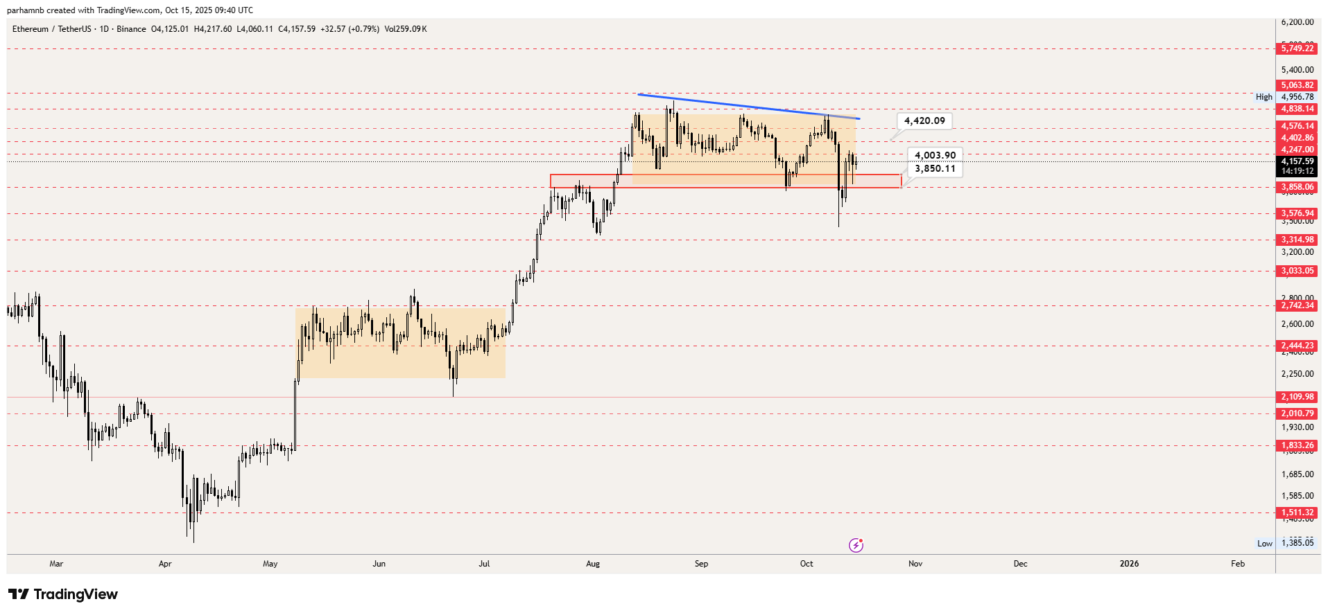 ناحیه ۳۸۵۰ تا ۴۰۰۰ دلار به عنوان حمایت اصلی اتریوم است و تا زمانی که قیمت این محدوده را حفظ کند، سناریوی صعودی همچنان پابرجاست. در صورت عبور موفق قیمت از ۴۲۴۰ دلار، احتمال حرکت مجدد به سمت مقاومت ۴۴۲۰ دلار بالاست. شکست پرقدرت این سطح میتواند باعث شروع موج صعودی جدید باشد.