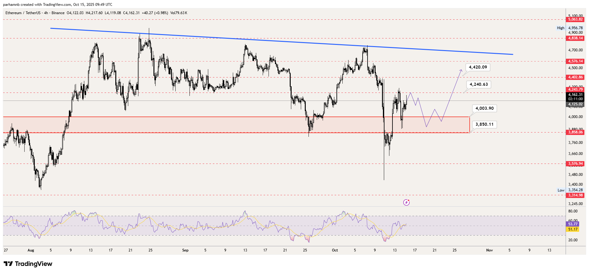 اتریوم در هفته اخیر توانست پس از اصلاحی عمیق، دوباره قیمت خود را به بالای محدوده ۴۰۰۰ دلاری برساند و اکنون در نزدیکی مقاومت مهمی قرار دارد. در تایم فریم روزانه، ساختار بازار همچنان صعودی است، اما برای تأیید ادامهی روند، نیاز به شکست قاطع سطح ۴۴۲۰ دلار وجود دارد. از سوی دیگر، حفظ حمایت ۳۸۵۰ دلاری میتواند پشتوانهی مهمی برای شروع رالی جدید باشد.