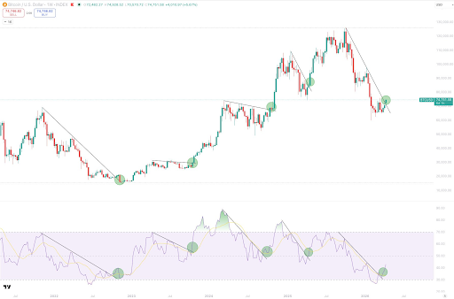 با نگاه به نموداری که سایکودلیک به اشتراک گذاشته، ساختار قیمتی هفتگی نشان می‌دهد که بیت کوین از خط روند نزولی بالای ۷۰٬۰۰۰ دلار خارج شده است؛ الگویی که هم در کندل‌های قیمتی و هم در پنل RSI قابل مشاهده است. شکست‌های مشابه در سال‌های ۲۰۲۲ (۱۴۰۱)، ۲۰۲۳ (۱۴۰۲) و اوایل ۲۰۲۵ (۱۴۰۴) نیز با شکست RSI از خط روند نزولی همراه بودند. تمام این عوامل به محیط بازاری کمک می‌کنند که در آن ادامه روند نزولی دشوارتر می‌شود. با وجود اطمینان سایکودلیک، او از اعلام قطعی پایان خطر خودداری کرد. مهم‌ترین نکته اکنون مشاهده نحوه بسته شدن کندل هفتگی بیت کوین است. در زمان نگارش این مطلب، خرید بیت کوین با قیمت ۷۵٬۸۱۸ دلار معامله می‌شود که ۱٫۴ درصد در ۲۴ ساعت گذشته رشد داشته است.