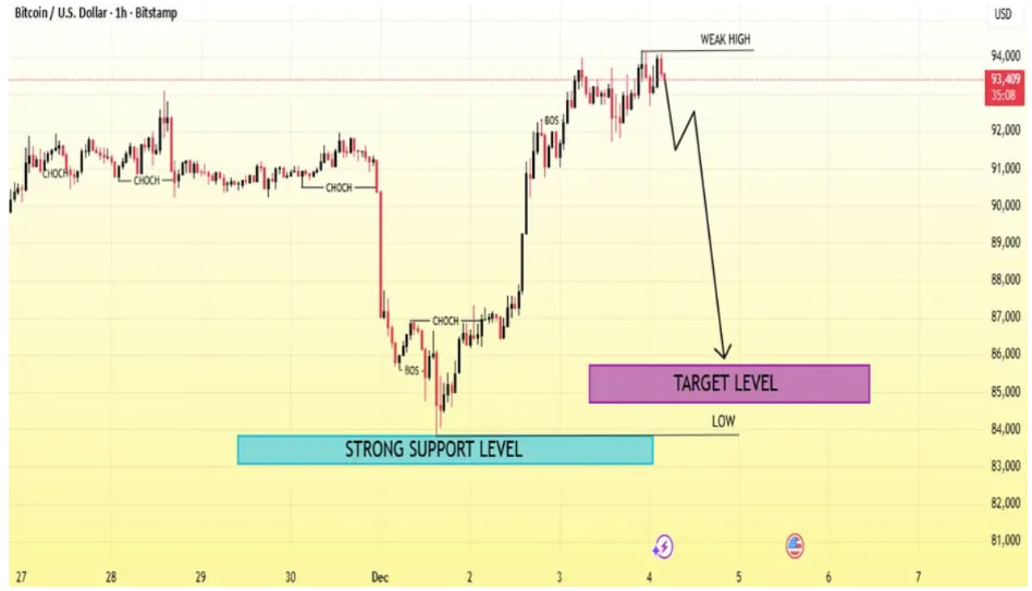 در این تحلیل آمده که ساختار قیمتی فعلی بیت کوین با یک «سقف ضعیف» (Weak High) شروع میشود؛ الگویی که اغلب پیش از ورود بازار به فاز بازگشتی و جمعآوری نقدینگی دیده میشود. ظهور سقف ضعیف نزدیک اوج اخیر رالی بیت کوین، نشاندهنده خروج خریداران پیش از اتمام تغییر روند و آغاز تشکیل سقفهای پایینتر (Lower High) است؛ نشانهای که معمولاً یک ساختار نزولی در بازار رقم میزند.