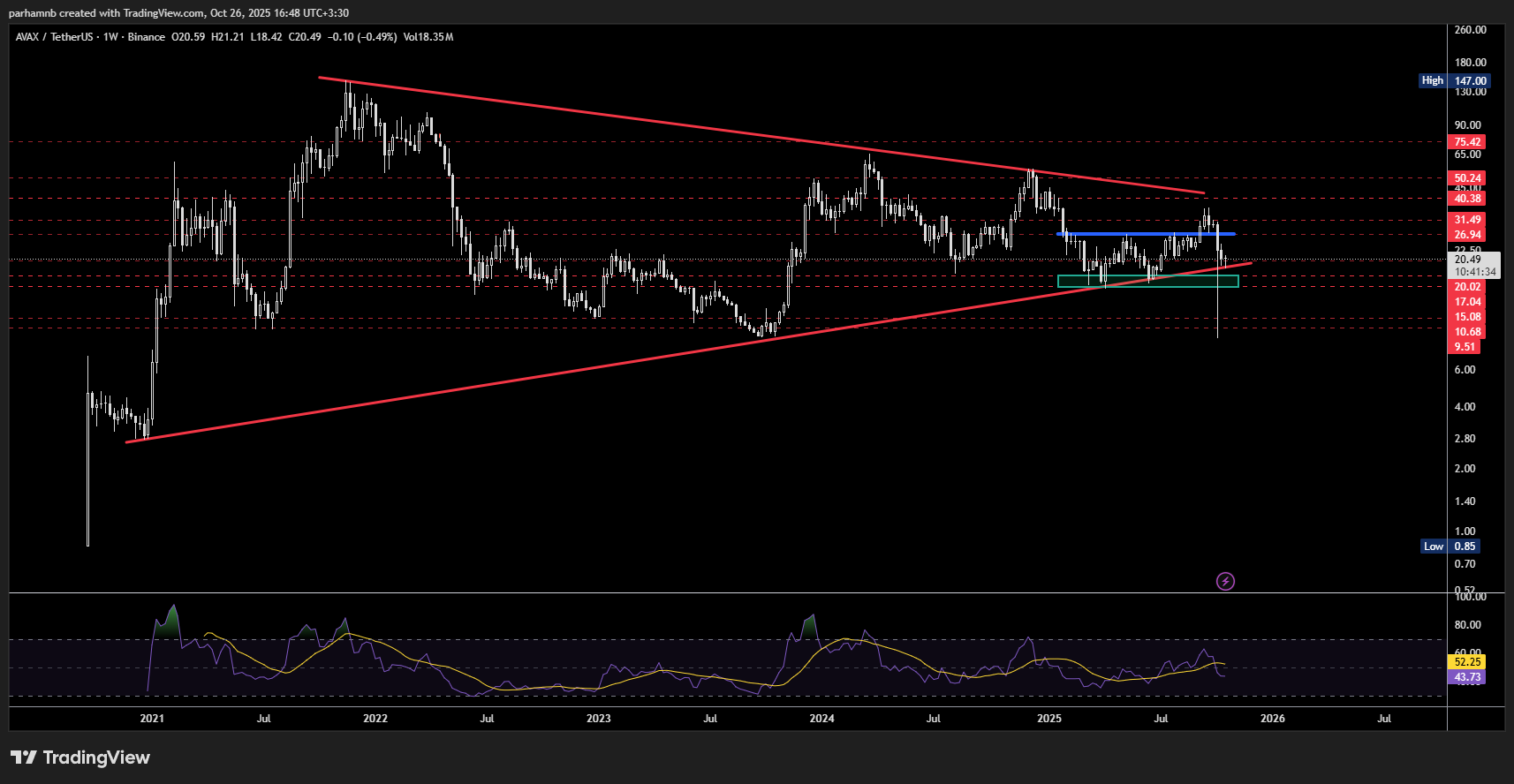در این تحلیل به بررسی وضعیت قیمت آوالانچ در تایم فریمهای هفتگی و روزانه میپردازیم تا چشمانداز دقیقتری از سطوح حمایت و مقاومت و سناریوهای پیشرو ارائه دهیم.