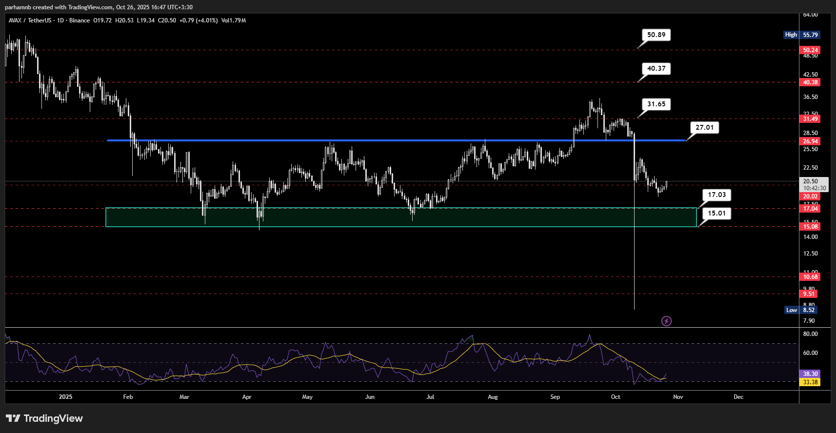 در تایم روزانه، رفتار قیمت آوالانچ خنثی است و بین دو سطح کلیدی در نوسان است. پس از تلاش ناموفق برای عبور و تثبیت بالای مقاومت ۲۷ دلاری، قیمت بار دیگر به زیر این سطح بازگشته و اکنون بالای حمایت ۱۵ تا ۱۷ دلار در حال نوسان است.