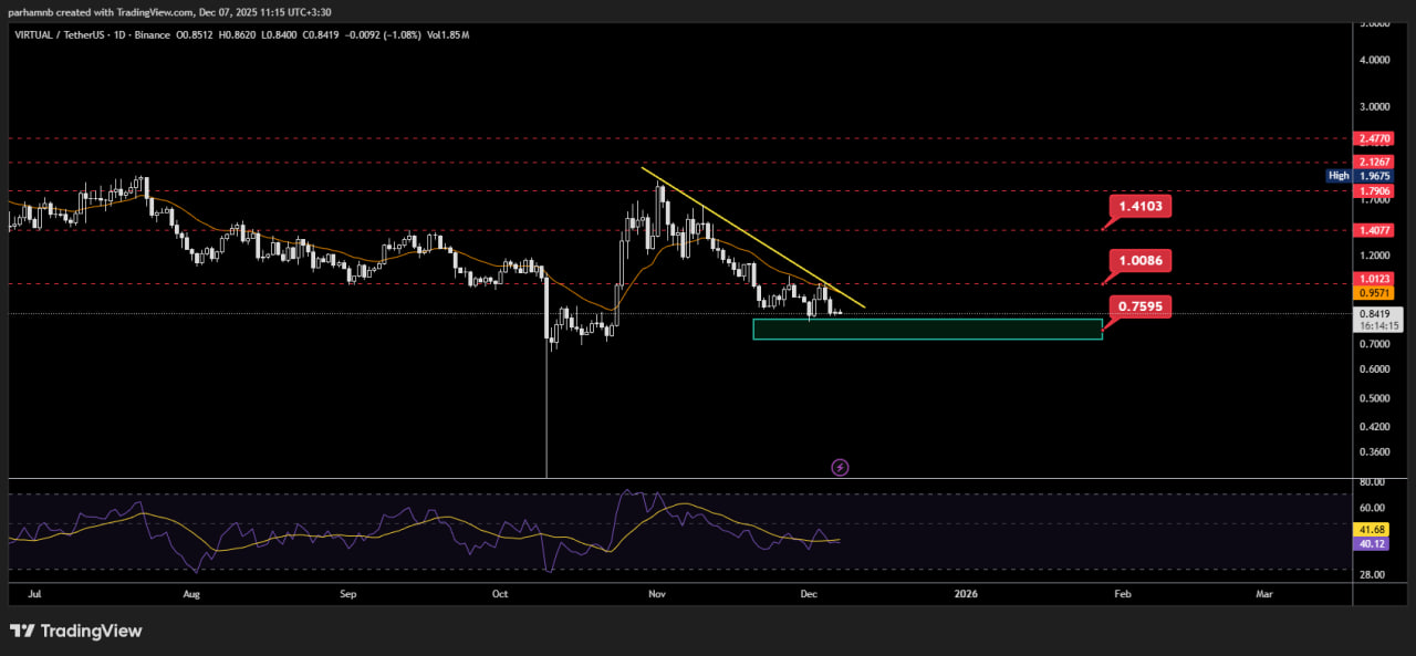 در نمودار قیمت ویرچوال پروتکل مشاهده میکنیم که VIRTUAL مدتها زیر مقاومت داینامیک قدرتمند درگیر است و اکنون نیز خود را به یکی از مهمترین حمایتهای روزانه رسانده است. این ناحیه حمایتی که در عدد ۰.۷۵ دلار قرار دارد، منطقه مهمی برای این رمزاراز محسوب میشود و واکنش قیمت به آن برای ادامه مسیر کاملاً حیاتی است.