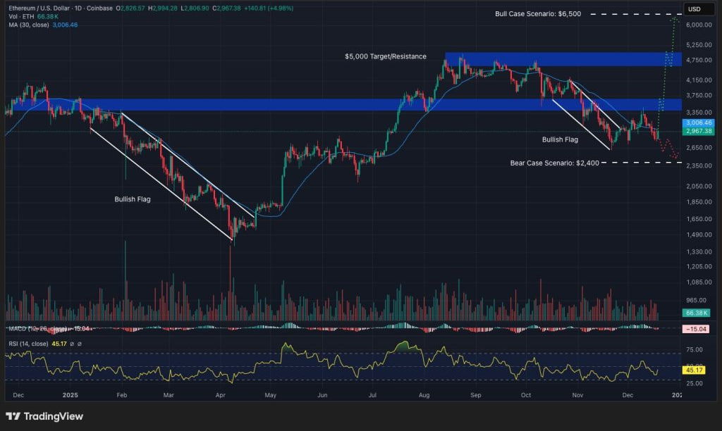با این حال، حرکت به سمت اعداد پنج رقمی احتمالاً به مقررات واضحتر در آمریکا و یک محیط کلان اقتصادی حمایتی وابسته است؛ دو عاملی که میتوانند مشارکت نهادی بیشتری را فعال کنند. در اوایل امسال، ETH از یک الگوی پرچم صعودی خارج شد و از ۱,۸۰۰ دلار به قلهی تازهای رسید. حفظ مومنتوم صعودی پایدار برای رسیدن اتریوم به سقف تاریخی جدید تا سال نو، ضروری خواهد بود.