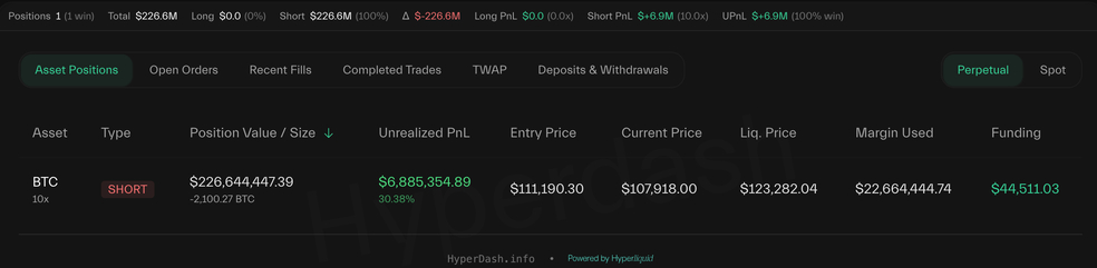 یکی از نهنگهای بازار کریپتو که طی ریزش اخیر، موفق به کسب سود حدود ۱۹۷ میلیون دلار شده بود، حالا با معاملهای جدید روبهروست: او پوزیشن فروش (Short) بزرگی به ارزش حدود ۲۲۶.۶ میلیون دلار روی بیت کوین باز کرده است. دادههای آنچین نشان میدهد این معامله با اهرم ۱۰ برابر صورت گرفته و قیمت لیکویید شدن (liquidation) برای آن در سطح تقریباً ۱۲۳٬۲۸۲ دلار قرار دارد.