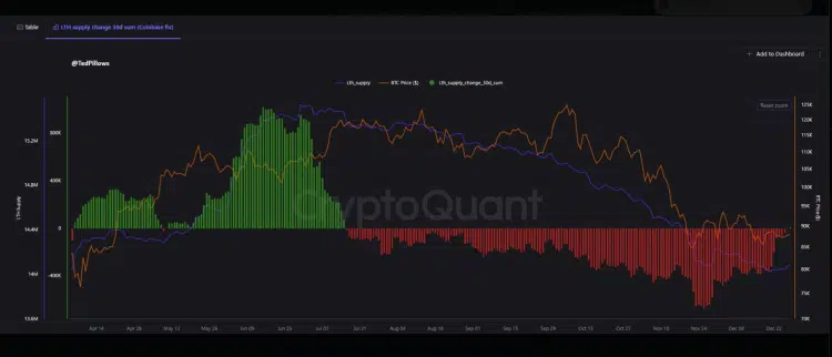 دادههای آنچین شبکه بیت کوین هم نشان میدهد کیف پولهایی که دستکم ۱۵۵ روز بیت کوین نگه داشتهاند، موجودی خود را از نزدیک به ۱۵ میلیون کوین در میانه ژوئیه به اندکی بیش از ۱۴ میلیون در دسامبر کاهش دادند. در عین حال، تد پیلووز (Ted Pillows)، سرمایهگذار کریپتو، در ۲۹ دسامبر ۲۰۲۵ در ایکس اعلام کرد هولدرهای بلندمدت «برای نخستین بار از ژوئیه ۲۰۲۵ فروش بیت کوین را متوقف کردهاند»؛ نکتهای که برخی آن را نشانهای از تغییر رفتاری احتمالی هولدرها تلقی کردند و از احتمال یک رالی تنفسی سخن گفتند.