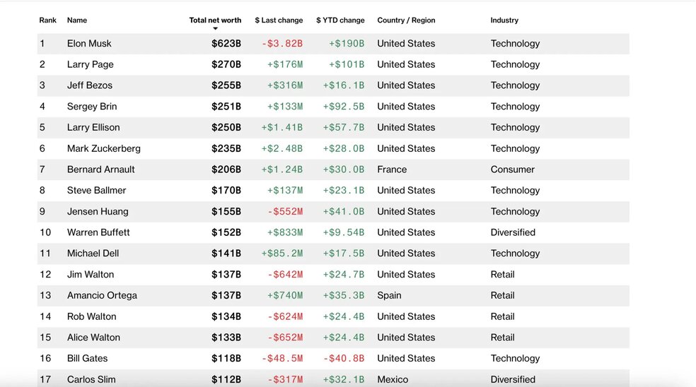 در همین حال، لری الیسون سال درخشانی داشت و با اوج‌گیری کسب‌وکار هوش مصنوعی Oracle، مدتی عنوان ثروتمندترین فرد جهان را از آن خود کرد. ثروت او با رشد ۵۷.۷ میلیارد دلاری به ۲۴۹.۸ میلیارد دلار رسید.