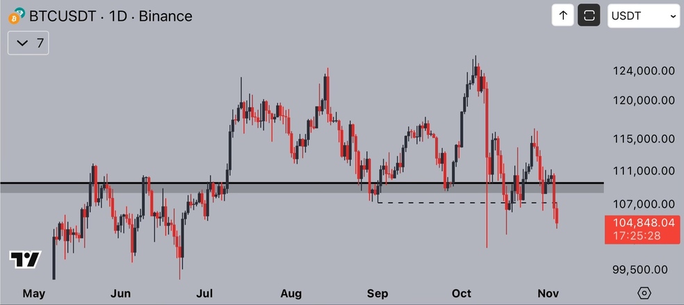- قیمت بیت کوین با سقوط به زیر ۱۰۴ هزار دلار حدود ۱۷ درصد از سقف تاریخی خود فاصله گرفت و سطح ۱۰۰ هزار دلار آخرین حمایت حیاتی بازار محسوب میشود.