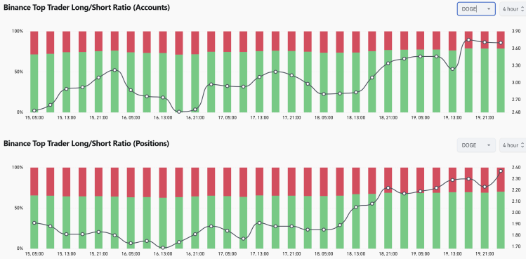 سی‌دبلیو این حرکت را این‌گونه توصیف کرد: «در میان روند کم‌رمق فعلی، تریدرهای برتر بایننس پوزیشن‌های لانگ خود روی دوج کوین را افزایش می‌دهند. آن‌ها در سکوت شرط‌بندی‌های خود روی افزایش قیمت دوج کوین را بیشتر می‌کنند.» نمودارها نیز این موضوع را تأیید می‌کنند. در نمای ۲۴ ساعته، نسبت لانگ به شورت برای حساب‌های تریدرهای برتر در تاریخ ۲۰ آوریل (۳۱ فروردین) ساعت ۰۲:۰۰ به ۳٫۶۳ رسید. در این زمان ۷۸٫۴ درصد از حساب‌ها پوزیشن لانگ و ۲۱٫۶ درصد پوزیشن شورت داشتند.