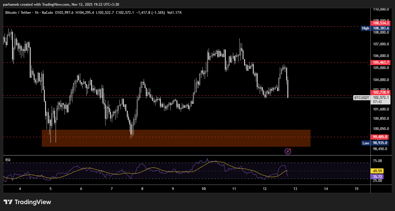 در تایم فریم ۱ ساعته، بیت کوین پس از حرکت نوسانی نزولی از محدوده ۱۰۷ هزار دلار تا ۱۰۲ هزار دلار کاهش یافت. در این مسیر، کندلهای نزولی متوالی با حجم بالای فروش شکل گرفتند که نشانهای از خروج نقدینگی از بازار است.