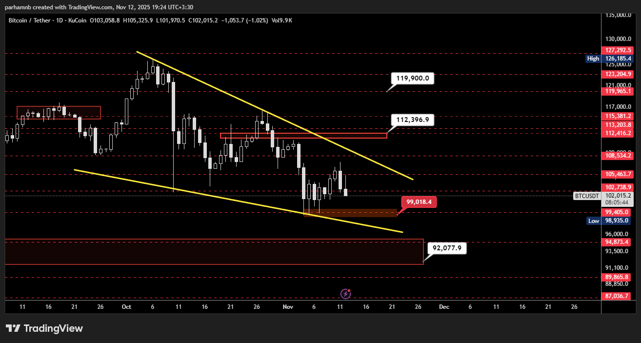 قیمت در حال حاضر در محدوده ۱۰۲ هزار دلار معامله میشود و در کوتاهمدت احتمال لمس محدوده حمایتی ۹۹ هزار دلار وجود دارد. با این حال، نواحی حمایتی کلیدی در تایم فریم روزانه هنوز حفظ شده و امکان بازگشت در میانمدت همچنان وجود دارد.
