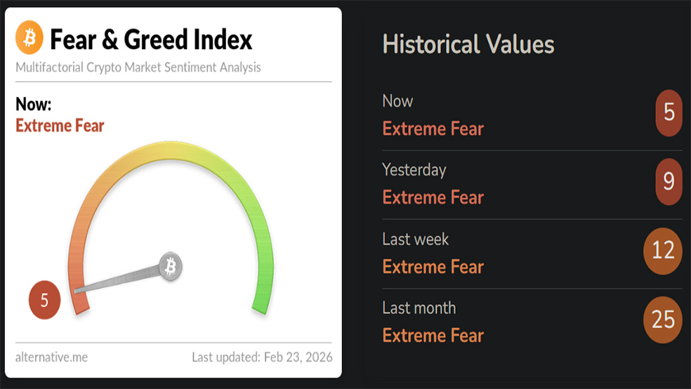شاخص ترس و طمع وب‌سایت آلترناتیو (Alternative.me) به عدد ۵ از ۱۰۰ رسیده که بیانگر «ترس شدید» است. از زمان راه‌اندازی این شاخص در سال ۲۰۱۸، تنها ۳ بار چنین سطحی ثبت شده که مربوط به آگوست ۲۰۱۹، ژوئن ۲۰۲۲ و اوایل همین ماه بوده است. همچنین شرکت تحلیلی گلس‌نود (Glassnode) گزارش داد میانگین متحرک ۷ روزه زیان محقق‌شده سرمایه‌گذاران جدید همچنان نزدیک به ۵۰۰ میلیون دلار در روز است که از ادامه تسلیم شدن معامله‌گران حکایت دارد.