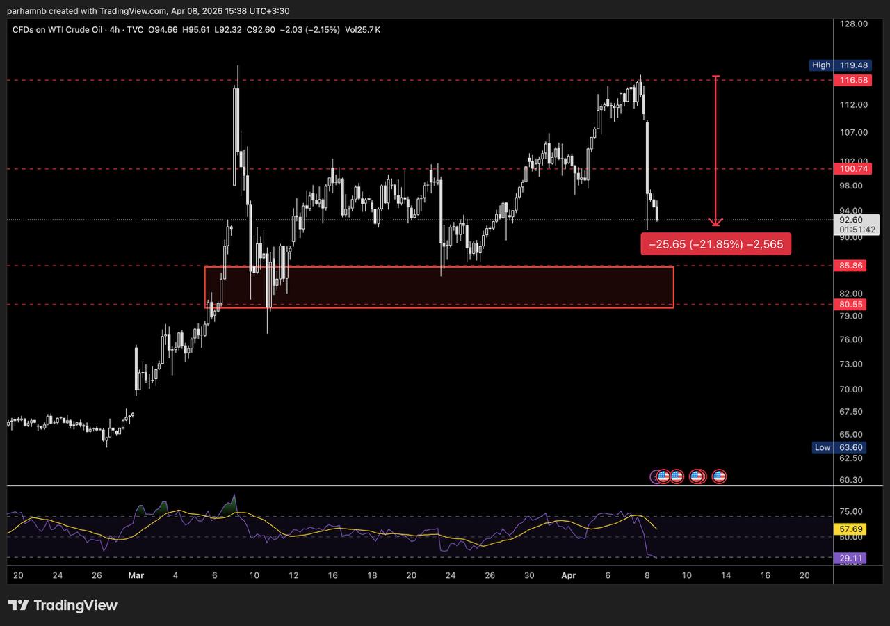 با بررسی نمودار روزانه‌ی نفت، مشاهده می‌شود که قیمت پس از نزدیک‌شدن به محدوده‌ی سقف ۱۲۰ دلار با یک ریزش تند و پرشتاب مواجه شده و در مجموع حدود ۲۰ درصد افت را تجربه کرده است. در حال حاضر، نفت در حوالی ۹۲ دلار معامله می‌شود و از منظر تکنیکال، مهم‌ترین ناحیه‌ی حمایتی پیش رو روی باکس قرمز قرار دارد؛ یعنی محدوده‌ی ۸۰ تا ۸۵ دلار.