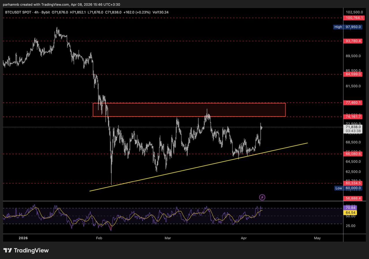 در ادامه، اگر قیمت موفق به تثبیت و سپس شکست معتبر محدوده‌ی ۷۵ هزار دلار شود، می‌توان انتظار داشت مسیر صعودی تا حوالی ۹۴٬۸۰۰ دلار نیز ادامه پیدا کند.