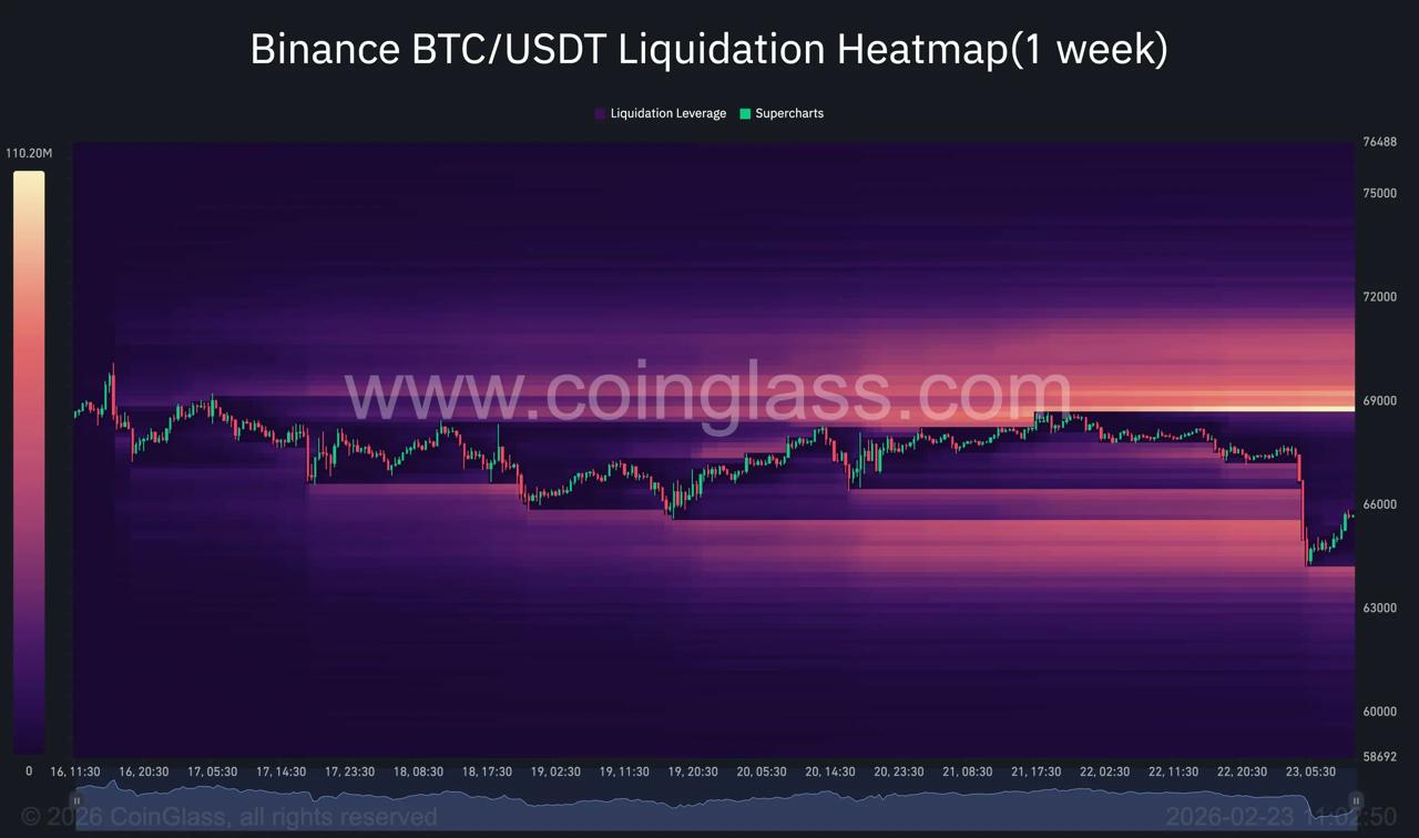 نقشهی حرارتی لیکوییدیشنها نشان میدهد بالای قیمت فعلی، در محدودهی ۶۹ تا ۷۰ هزار دلار، یک خوشهی نقدینگی متراکم وجود دارد. این محدوده در دورهی رنج قبلی، نقش یک «مگنت قیمتی» را بازی میکرد و قیمت چندین بار به آن جذب شد. همین موضوع توضیح میدهد چرا نقدینگی بالاسری هنوز تلاشهای صعودی را محدود میکند.