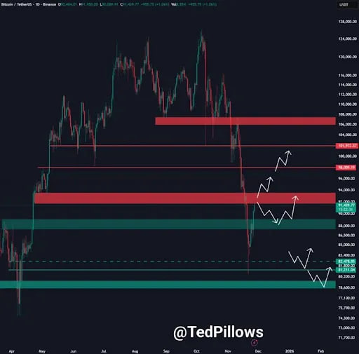 در کنار تحلیل فوق، تحلیلگر دیگری به نام تد پیلووز (Ted Pillows) نیز نگاهی دوگانه به وضعیت قیمت بیت کوین ارائه داده است. او به نقاط کلیدی برای جلوگیری از اصلاح عمیقتر اشاره میکند و شرح میدهد که آیندهی بیت کوین وابسته به عملکرد قیمت در روزهای آینده خواهد بود.