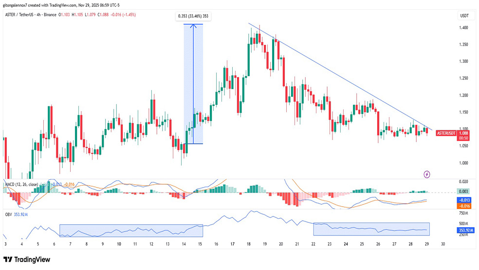 با وجود شرایط نهچندان مطلوب شبکه، الگوهای تاریخی بار دیگر دیده میشود و این سؤال مطرح است که آیا استر در دسامبر میتواند یک رشد ۳۰ درصدی را تکرار کند؟ نمودار ۴ ساعته نشان میدهد پس از اصلاحی که قیمت را تا ۱.۴۰ دلار بالا برد، بازار وارد فاز انباشت شده است. این رفتار مشابه روندی است که در هفته اول نوامبر ثبت شده بود و در آن زمان منجر به حرکت قیمت تا محدوده ۱.۵۰ دلار شد.