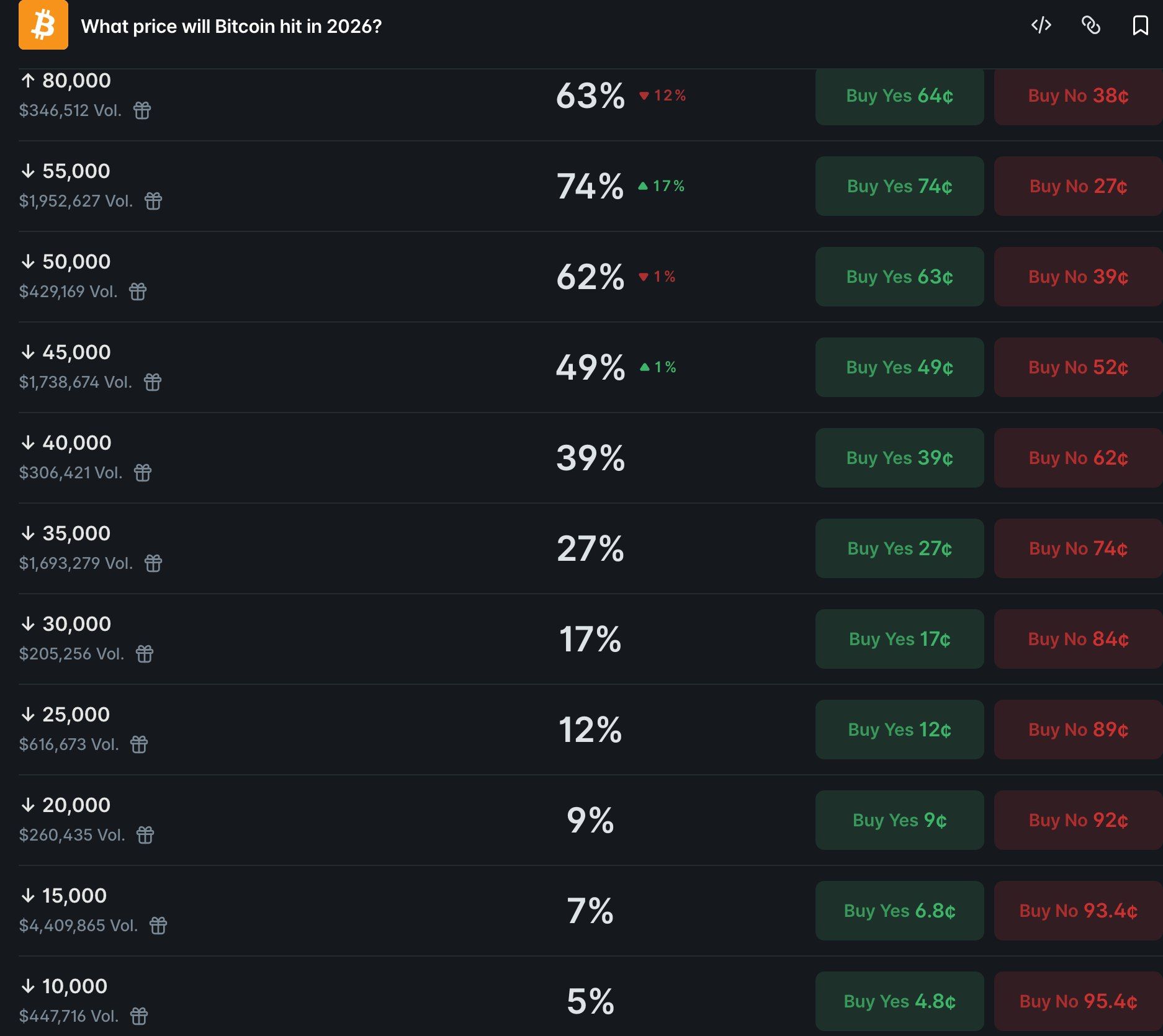 قیمتگذاری بازار پیشبینی که در اطلاعات ارائهشده توضیح داده شده، نشان میدهد معاملهگران بیشتر به سمت مناطق هدف پایینتر متمایل هستند تا سقوط کامل به ۱۰ هزار دلار. بر اساس این ارقام، بالاترین احتمال روی تابلو حدود ۵۵ هزار دلار با ۷۴ درصد شانس است که ۱۷ درصد افزایش یافته. سطح ۵۰ هزار دلار با ۶۲ درصد، ۴۵ هزار دلار با ۴۹ درصد و ۴۰ هزار دلار با ۳۹ درصد احتمال ثبت شده است.