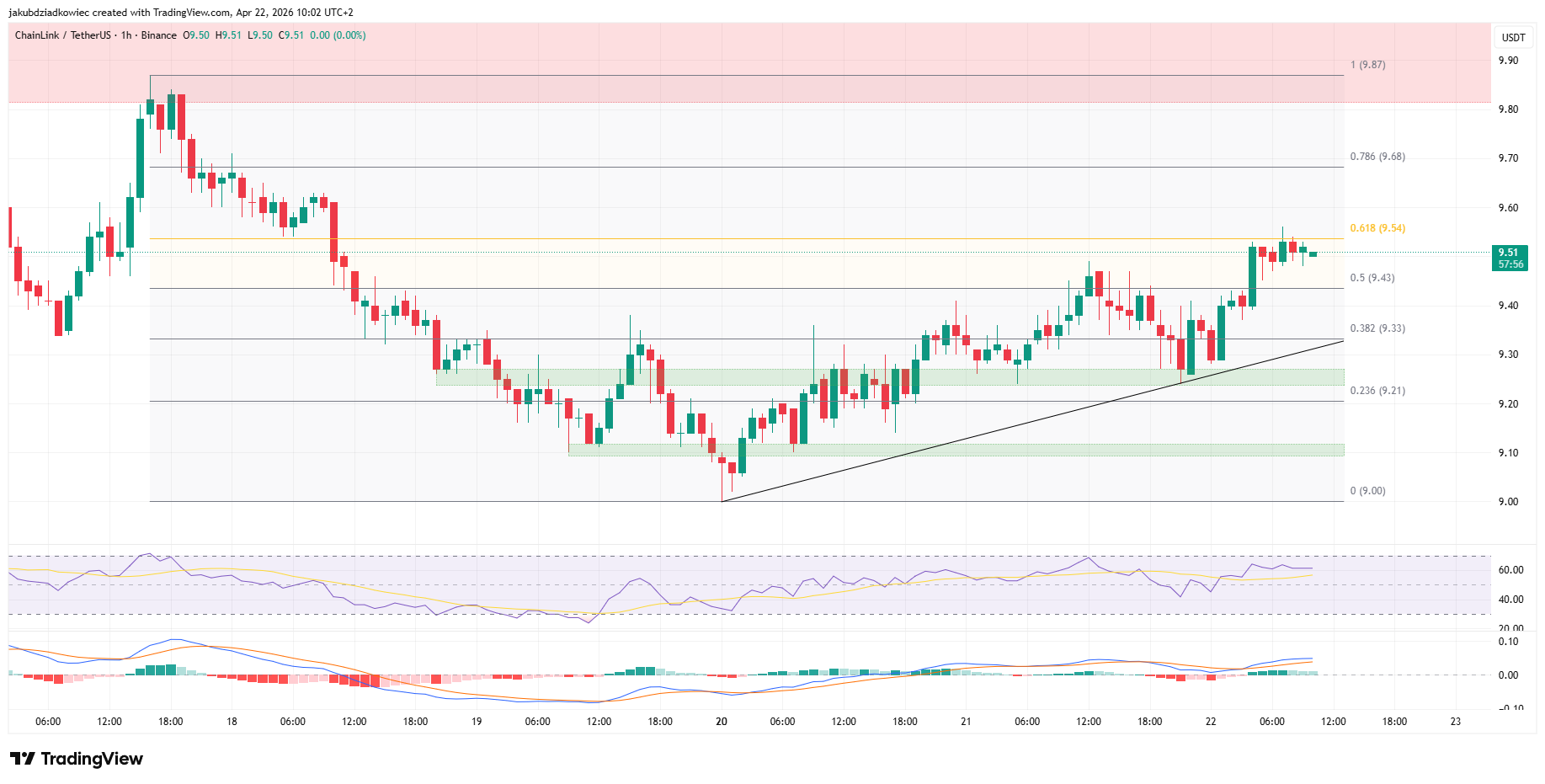 در همین حال، در نمودار یکساعته فروش و خرید چین لینک پس از لمس ۹٫۵۴ دلار در ۹٫۵۱ دلار معامله میشود. این سطح نشاندهنده اصلاح ۰٫۶۱۸ از نوسان ۹٫۸۷ به ۹٫۰۰ دلار است. اولین حمایت در فیبوناچی ۰٫۳۸۲ نزدیک ۹٫۳۳ دلار قرار دارد که با یک خط روند صعودی از کف ۲۰ آوریل (۳۱ فروردین) تقویت شده است. جعبههای تقاضای دیگر در ۹٫۲۱ و ۹٫۱۰ دلار قرار دارند.