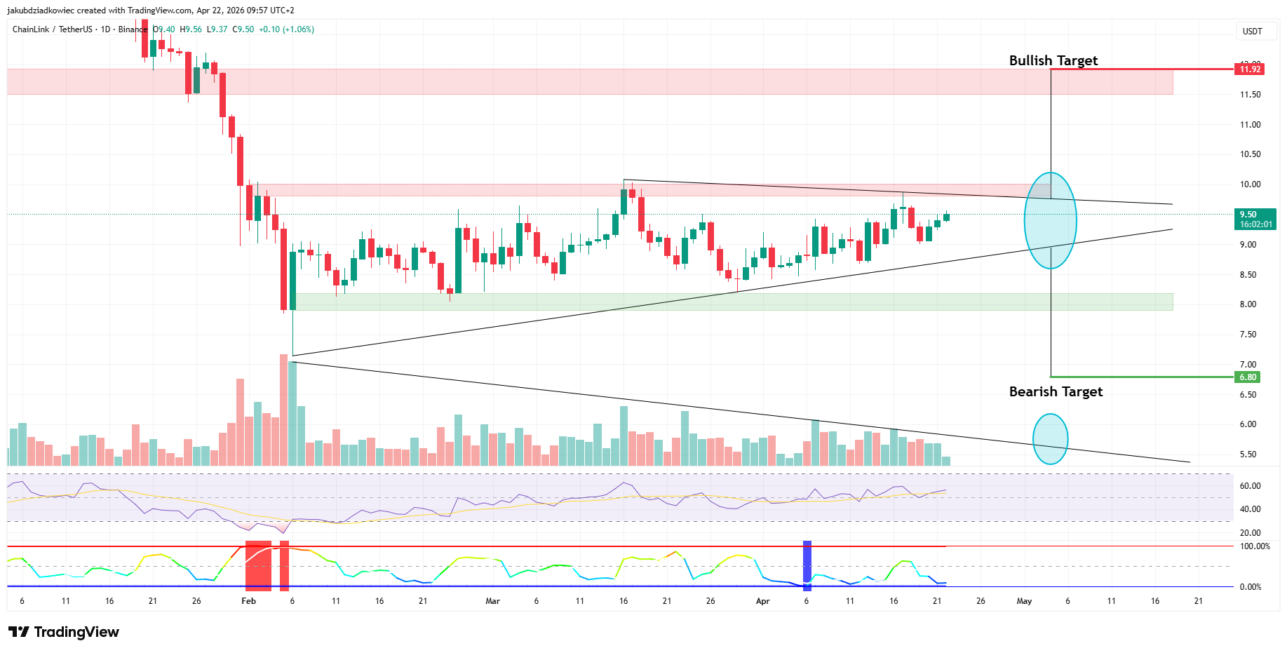 نمودار روزانه یک مثلث متقارن در حال انقباض را نشان میدهد. حمایت نزدیک ۸ دلار و مقاومت در حوالی ۱۰ دلار متمرکز شده است. چین لینک در این محدوده ارزش بازاری حدود ۶٫۸ میلیارد دلار دارد. این الگو تقریباً ۷۰ تا ۸۰ درصد بلوغ یافته و پهنای باند بولینگر (Bollinger Band Width) برای چند هفته در منطقه نوسان قیمت پایین باقی مانده است.