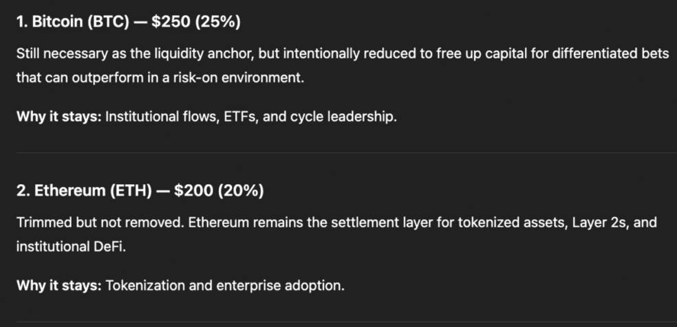 در این پورتفوی، بیت کوین با ۲۵۰ دلار به‌عنوان دارایی اصلی انتخاب شد و با این‌که وزن آن کمتر از بسیاری سبدهای سنتی است، اما همچنان به‌عنوان هاب اصلی نقدشوندگی، دارایی ذخیره ارزش و رهبر بازار در نظر گرفته می‌شود. اتریوم با ۲۰۰ دلار در رتبه بعد قرار دارد؛ با این استدلال با وجود رقبا، هنوز لایه تسویه‌ی برتر برای دیفای و توکن‌سازی دارایی‌های دنیای واقعی (RWA) است.