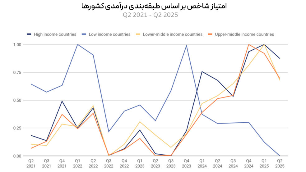 با این حال، نکته قابلتوجهی در مورد گروه کشورهای کمدرآمد (Low-Income Countries – LIC) وجود دارد. این دسته شامل کشورهایی است که معمولا انتظار نمیرود سطوح بالایی از استفادهی پایدار از رمزارز داشته باشند؛ اما همین ترکیب خاص موجب میشود که دادههای این گروه نوسانات شدیدی را نشان دهد؛ یعنی دورههای رشد سریع و سپس افت ناگهانی.