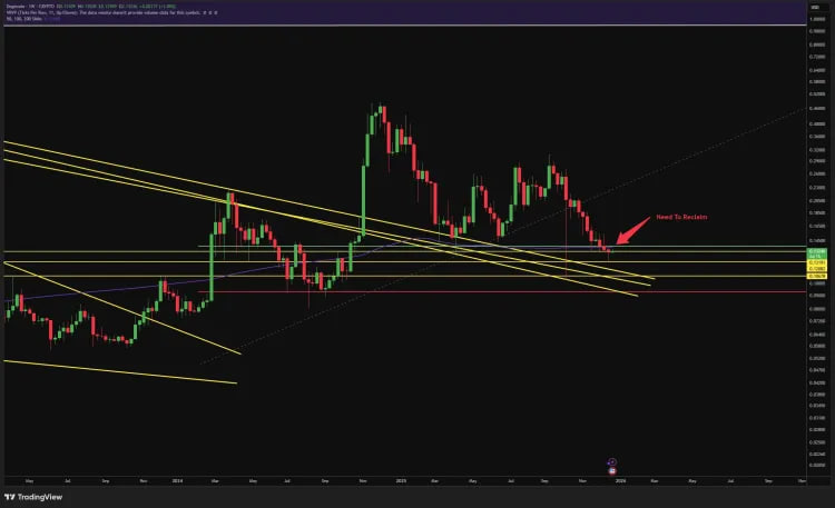 برای زمینهی بلندمدتتر، کوین قبلاً به محدودهی ۰.۱۴۳ تا ۰.۱۲۷ دلار بهعنوان یک ناحیهی تصمیمگیری مهم برای دوج کوین اشاره کرده بود. او در پستی در ژوئن ۲۰۲۵ اشاره کرد که از زمان شکست RSI هفتگی در ۲۰۲۲، دوج کوین بارها پس از بازدید مجدد از RSI هفتگی زیر ۴۰ بازگشته، چیزی که پنج بار اتفاق افتاده است. شکست این سطح RSI هفتگی همراه با شکست سطح ۰.۱۴۳ تا ۰.۱۲۷ دلار، خط قرمز بین حرکت قیمتی نزولی بلندمدت یا ادامهی روند صعودی خواهد بود.