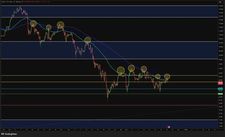در حالی که او گفت تایم فریمهای سهروزه و هفتگی تمرکز اصلی هستند، اما استدلال کرد که تا زمانی که بیت کوین این میانگینهای متحرک را پاک نکند و باند ۸۸ هزار تا ۹۱ هزار دلار را در بستهشدنهای تایم فریم بالاتر بازپس نگیرد، تأیید کف با اطمینان دشوار است و مومنتوم همچنان به نفع خرسهاست.