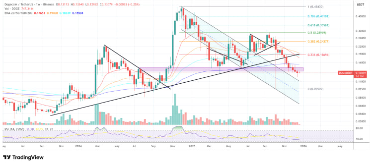 کوین (Kev_Capital_TA)، تحلیلگر بازار کریپتو، در پستی در پلتفرم ایکس در ۲۳ دسامبر توضیح داد که بازپسگیری سطح ۰.۱۳۸ دلار در بستهشدنهای سهروزه و هفتگی، دوج کوین را دوباره به بالای اصلاح فیبوناچی ۰.۳۸۲ و میانگین متحرک ۲۰۰ هفتهای میرساند که او آن را «نکته مثبت بزرگ» توصیف کرد.
