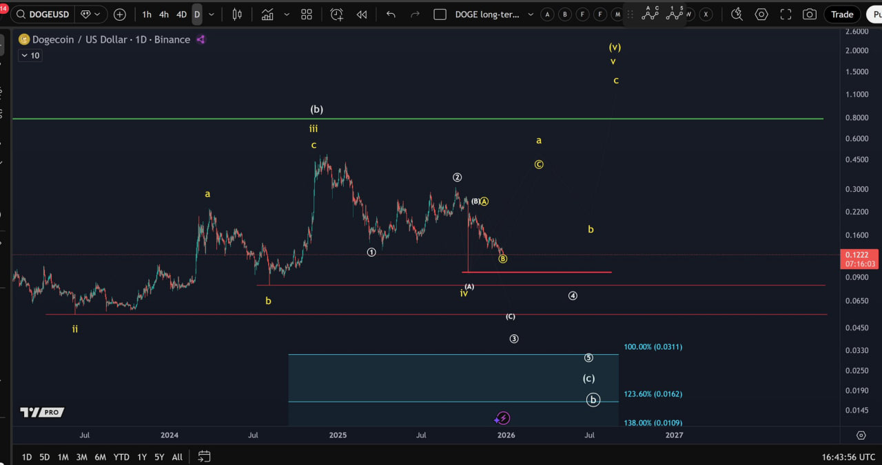 دوج کوین همچنان یک چاقوی در حال سقوط است و شواهدی مبنی بر پایان موج اصلاحی B وجود ندارد. در صورت شکست حمایت، احتمال افت ۲۰ درصدی به سمت حمایتهای کلیدی بعدی در ۰.۰۹۶ و ۰.۰۸ دلار وجود دارد و تا زمانی که اولین موج کوچک صعودی ۵ تایی مشاهده نشود، احتیاط ضروری است.