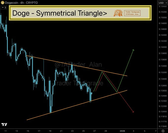 تریدری به نام Trader Tardigrade اشاره کرد که دوج کوین در حال شکلدهی یک الگوی مثلث متقارن جدید در نمودار ۴ ساعته بوده است که میتواند منجر به یک حرکت ۱۵ درصدی در جهت شکست شود. نکتهی نگرانکننده این است که پولبک روز جمعه، قیمت را به زیر مرز پایینی این الگو (حدود ۰.۱۲۳ دلار) فرستاده است. این شکست نزولی سیگنال میدهد که اگر قیمت بهزودی بازنگردد، افت به سمت ناحیهی ۰.۱۰-۰.۱۱ دلار محتمل است.