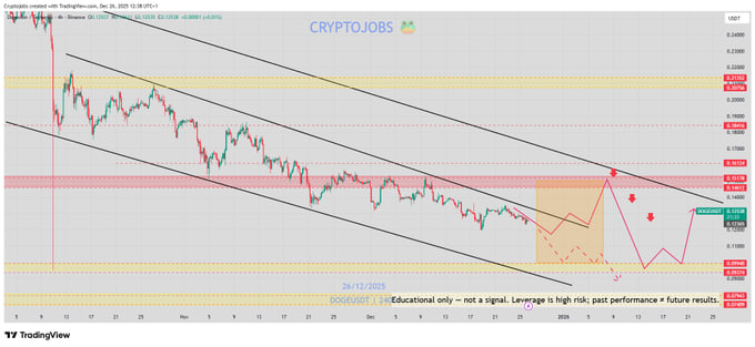همچنین تحلیلگری به نام Crypto Jobs هشدار داد که برخلاف بسیاری از آلت کوینهای دیگر، دوج کوین ساختار بازگشتی صعودی ندارد و حجم خرید آن ضعیف است. او معتقد است تا زمانی که قیمت زیر محدودهی ۰.۱۴-۰.۱۵ دلار باقی بماند، روند نزولی دستنخورده باقی میماند و اصلاح به سمت ۰.۱۰۰-۰.۰۹۵ دلار دور از انتظار نیست.