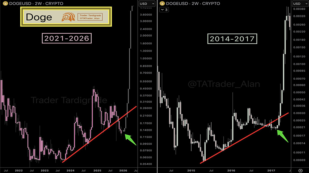 بر اساس نمودار دو‌هفته‌ای منتشرشده توسط تحلیلگر تریدر تاردیگرید (Trader Tardigrade)، دوج‌کوین نشانه‌ای تکنیکال و مهم در تایم‌فریم‌های بلندمدت از خود به نمایش گذاشته است. این نمودار ساختار فعلی قیمت دوج‌کوین را با چرخه قیمتی سال‌های ۲۰۱۴ تا ۲۰۱۷ مقایسه می‌کند و شباهت قابل‌توجهی را در نقطه شکست روند نمایش می‌دهد؛ شکستی که در گذشته آغازگر یک رشد قدرتمند بوده است.