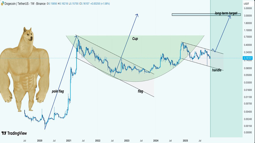 به گفته این تحلیلگر، تشکیل این الگو فقط مربوط به ماه‌های اخیر نیست، بلکه ریشه آن به سال ۲۰۲۱ برمی‌گردد؛ دوره‌ای که قیمت دوج‌ کوین طی یک رشد افسانه‌ای ۳۶۰۰۰ درصدی به اوج تاریخی خود رسید. این حرکت قدرتمند باعث شکل‌گیری یک الگوی فنجان بلندمدت شد که چند سال در حال تکمیل بوده است. این فنجان بزرگ نشانه‌ای از انباشت بلندمدت دوج‌ کوین محسوب می‌شود.