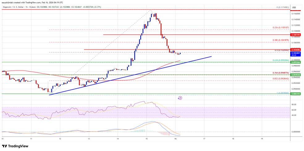 این در حالی است که دوج کوین برخلاف بیت کوین (BTC) و اتریوم (ETH) نتوانست سطح ۰٫۱۱۷۵ دلار را بشکند و وارد اصلاح نزولی شد. قیمت به زیر سطوح ۰٫۱۱۲۰ و ۰٫۱۰۸۰ دلار سقوط کرد. همچنین حرکتی به زیر سطح ۵۰ درصدی فیبوناچی اصلاحی از کف نوسانی ۰٫۰۸۷۸ دلار تا سقف ۰٫۱۱۷۵ دلار رخ داد. فروشندگان حتی قیمت را به زیر ۰٫۱۰۴۰ دلار رساندند، اما خط روند صعودی با حمایت ۰٫۱۰ دلار همچنان پابرجاست.