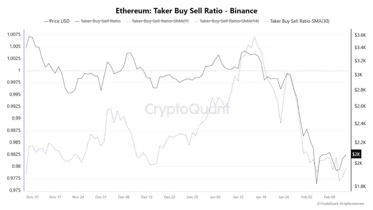 کریپتوآنچین (CryptoOnchain)، تحلیلگر بازار، در پستی اخیر توضیح داده که معاملهگران مشتقات اتریوم در حال حاضر تحت سلطه فروشندگان تهاجمی قرار دارند. این موضوع از طریق شاخص نسبت خرید به فروش تیکر (Taker Buy Sell Ratio) در صرافی بایننس و با استفاده از میانگین متحرک ۳۰ روزه مشخص شده است.