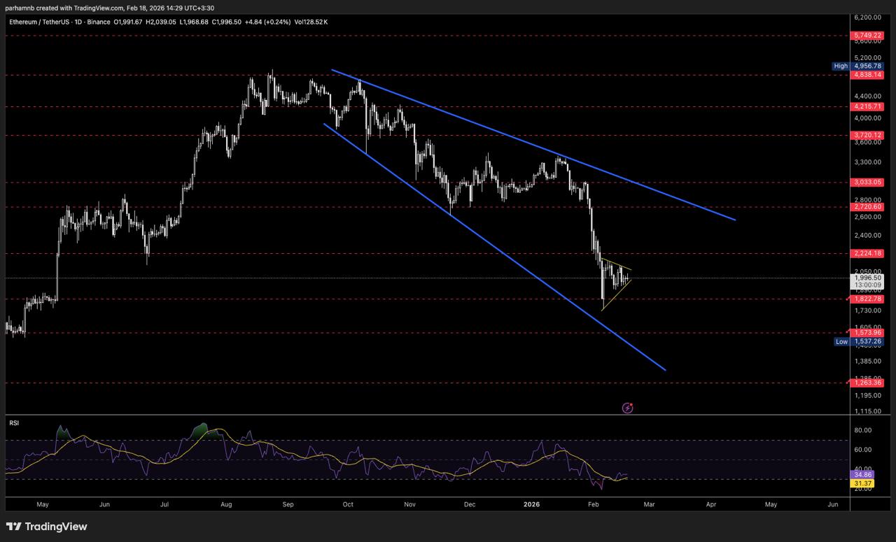 در تایم فریم روزانه، ETH پس از سقوط شدید به کف الگوی بازشونده رسید و با لمس ناحیهی تقاضای ۱,۸۰۰ تا ۱,۸۵۰ دلار، وارد فاز تثبیت شد. کندلهای اخیر اصلاحات صعودی جزئی را نشان میدهند، اما این حرکتها فاقد ویژگیهای قدرتمند صعودی هستند و ماهیت اصلاحی دارند.